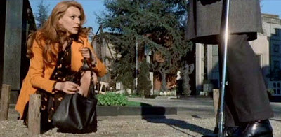 If only Nieves Navarro had displayed this kind of style-based edginess during the film's early going. Why, what's wrong with her sense of style in the early going? Are you sitting down? She's wears pants. Yep, you heard right, pants. Call 'em trousers, call 'em slacks, Nieves Navarro's lower half is covered with pants. Black pants, blue pants, tan pants, grey pants, you name the colour, she wears 'em in this movie.