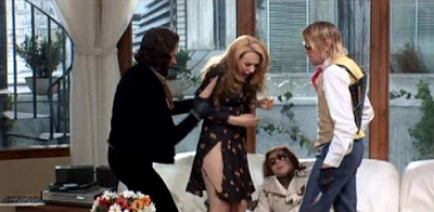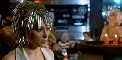 Since the police, especially Inspector Serino (Carlo Gentili), are no help at all when it comes to figuring out her unique dilemma, Valentina decides to cut lose. And how does an out of work fashion model pushing thirty cut lose? They put on their most metallic wig and paint the town red. Given that Stefano is a sculptor, do you think he made Valentina's metallic wig? I wouldn't be surprised. I mean, it doesn't look like the kind of item you'd find sitting on the shelf of your average wig shop. The wigs the members of Company B wore circa "Fascinated," on the other hand, are definitely the kind you can find at your average wig shop.