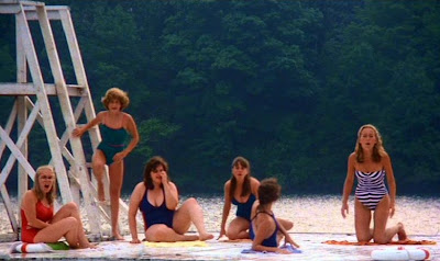 Seeing all the teens gathered in one place during the scene that takes place at the lake, the girls are sunning themselves on one of them swimming platform thingies (check out Tiger, rocking a dark green one piece bathing suit on the life guard tower - no wonder they call her Tiger, rawr!!!), the guys are busy goofing off on shore, you have to wonder: How is Crospy going to kill all these people in a such a short amount of time? What they [the producers] need to do is to have a mass cull. Yeah, just wipe five or six campers is one fell swoop. Just as long as Tiger isn't one of the five or six. Aw, man, if I see Tiger getting abroad that makeshift raft, which we all know is not going to make it very far, I'm going to freak out.