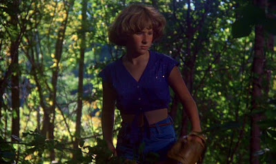 Just before another non-kill is about to take place, a misdirection involving a showering blonde camper named Sally (Carrick Glenn), you'll notice that Tiger has a pair of white knee-high socks hanging on her bed frame. Yeah, so what? So what?!? Well, I don't know if you know this, but Tiger doesn't wear knee-high socks, she wears lavender-coloured socks that barely go past her ankles. Again, so what? Don't you want to know whose socks they were? Not really. Fine