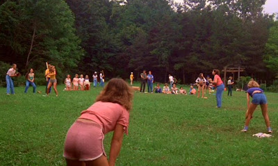 When we arrive at Camp Stonewater, the female campers are engaged in a heated game of baseball. What are male campers doing, you ask? Well, some of them, like, Alfred (Brian Backer, Fast Times at Ridgemount High), are cheering them on, while others, like, Eddy (Ned Eisenberg) and Dave (Jason Alexander), are admiring the ass attached to the lanky frame that belongs to Karen (Carolyn Houlihan), who is playing, oh, let's say, short-stop. Hey, I'm not one to judge their taste in women. But if I was at that game, my eyes would be all over Tiger (Shelley Bruce), the team's angelic first basewoman. Sporting cut-off jean shorts and a blue top tied at the belly for added sex appeal, Tiger is a baseball-playing goddess.