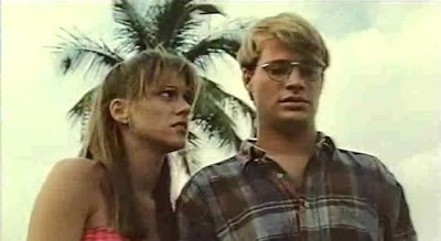 Oooh, quiet. My favourite Cruel Jaws character is about to show up. You mean that asshole with the dimpled chin? No, not Ronnie (Carter Collins), the son of the aforementioned jerk/businessman. Check out the woman he's running along the beach with. Wow, she's amazing. Who is she? Why, that is Glenda, Hampton Bay's resident short-haired, leggy troublemaker. Played by model Sky Palma, Glenda is one the few people in town whose facial expressions properly match the mood of their surroundings. In other words, if Glenda sees something horrible, like a badly decomposed body washed on the beach, she'll scream. If those "other words" aren't clear enough. What I think I'm trying to say is that Sky Palma is the only one doing any actual acting.