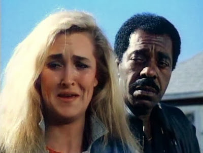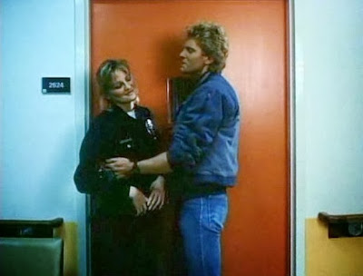 Hollywood cop?!? Yeah, right. Hollywood opportunist is more like it. Swooping in like a hungry vulture who has just spotted a wounded wildebeest, Det. Turquoise (David Goss, who, you might remember, was a production assistant on last season's The Bachelorette), "Turkey" to his friends, might look like he wants to help a struggling single mother get her son back from a gang of ruthless gangsters, but he's got an ulterior motive. Don't let his sort of strapping good looks or his fondness for denim fool you, he's got six million dollars on his mind. I know, how is a "struggling single mother" gonna scrounge together six million dollars to pay the gangsters who are holding her son for ransom? She isn't, but if she wants to see her son alive again, she better find out where her ex-husband is hiding, as the gangsters expect him to pay the hefty ransom. You see, her ex-husband stole six million from the gangsters, and when the gangsters discover his ex-wife living on a communal ranch outside of town, the gangsters attack it with the sole purpose of snatching their son. As expected, the regular cops drag their feet when it comes to investigating the possible whereabouts of her missing child. Oh, sure, they fill out all the necessary paperwork, but finding little Stevie (Brandon Angle) isn't exactly their top priority.(Are you sure that when Det. Turkey, and his partner, Jaguar (Lincoln Kilpatrick), approached a sobbing Rebecca (Julie Schoenhofer) on the street outside police headquarters in Hollywood, California that he had money on his mind? I mean, it looked like he was genuinely concerned about her welfare.) In the early going, yes, he was "genuinely concerned." But the moment he found out there was six million dollars at stake, his whole demenour seemed to change.