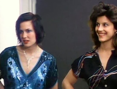 A total of eight leggy floozies are hoping to work for Feliciano: #1 - A floozy in a shiny bluish red top with spaghetti straps and dark trousers. (Hey, how come you didn't call her a "leggy floozy"?) Um, she wore trousers, and therefore she lost the right to be called "leggy." #2 - She doesn't sit with her legs crossed (a must for leggy floozies), but she is wearing a modest white dress with what looks like a pair of tan stockings.