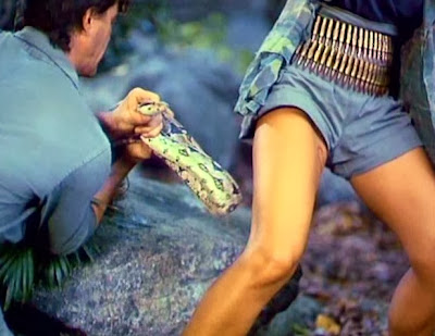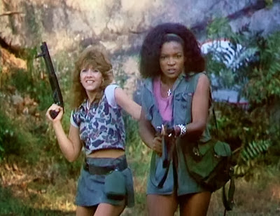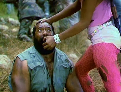 The black chick, Nancy, is played by the leggy Aleida Harris, and she gets her teeth knocked out, stuffs a grenade in a bad guy's mouth, and chops pair of conjoined twins in half with a machete (don't worry, they were totally evil).