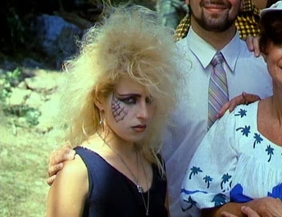 I'm not sure which blonde is which, but I do know they were played by Mary Yorio and Susan Bachli. The one in the black tights gets AIDS and kills a guy with a crossbow, while the one in the chartreuse tights gets shot in the ass by some fat fuck. (Hold on, "some fat fuck"? Show some respect, that's Joe Fleishaker, you ingrate. Anyway, what about the guy in the leather vest?) Oh, he's Sean (Alex Cserhart), he kills the director of Redneck Zombies with a guitar string. (Nice.)