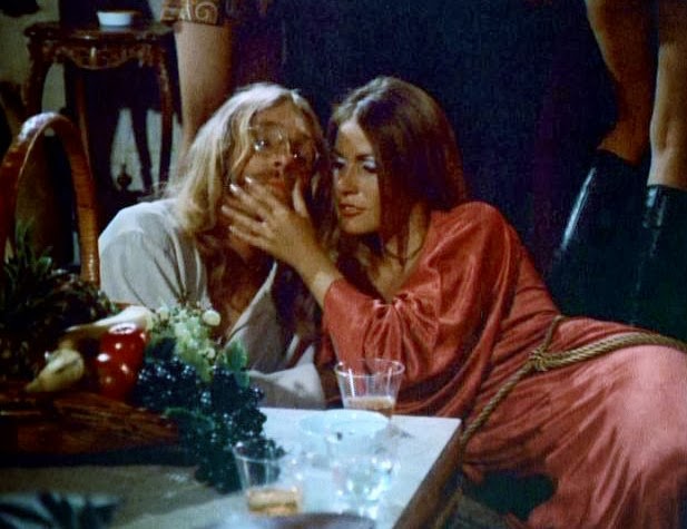 In-between the sentient bed linen scene and the one where a Neola Graef shows off her legs to some creep, Donna loses her shit and decides that she wants to leave. Unfortunately, the doors are locked. In other words, no one is allowed to leave. A couple of more "tricks" are performed for Uncle, one involving butcher shop necrophilia and another that takes a place at a picnic. While the film's signature piece is an extended orgy sequence. Instigated by a naked Debbie Osborne, who says, "Let's play commando," the party guests roll around on the floor together in an attempt to achieve sexual enlightenment.