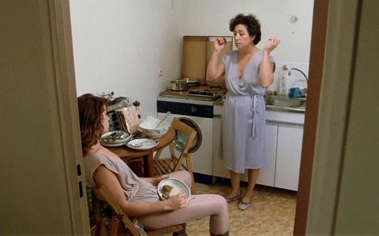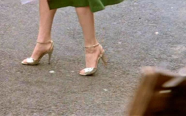After putting on the gold pumps, Ethel gets up and begins to clear the table. What's happens next is hands down one of the sexiest things I've ever seen. (Isn't this the film where Valérie Kaprisky dances naked on three separate occasions?) Oh, I see what you're saying. But, no, I still say Valérie Kaprisky clearing the table in a green new wave-tinged, Roman-style mini-tunic; gold strappy heels; and jet black pantyhose is way sexier. But, hey, that's just me.