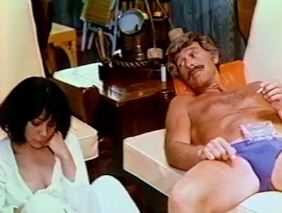 Itching to fuck something, Karen heads out to the beach to hump the sand. As she's doing that, we're introduced to a young couple, Tom (actor unknown) and his fiancee, let's call her Stacey (Clea Carson, also from Waterpower), floating in a small pleasure craft out on the water. It's not quite clear yet what these two have to do with Karen. But you know something sinister is afoot.