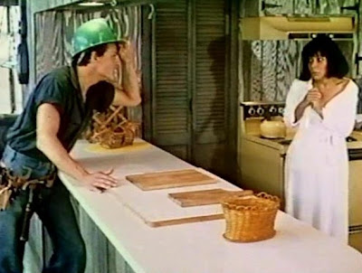 I just hope no one decides to drop by unannounced, as Karen's brand of mentally deranged lust isn't really meant for public consumption. Of course, someone does decide to drop by. If they didn't, it wouldn't be much of a movie, now, would it? Though, I could watch Karen shower and act deranged for hours on end. Well, most people don't think like you, so Larry the Lineman (Michael Gaunt) shows up in Karen's kitchen. Grabbing a knife and clutching the top of her bathrobe, Karen is visibly shaken by the sudden appearance of a man in a green hardhat. As Larry the Lineman pokes around a bit (chatting her up as he does so), Karen starts to hear voices.