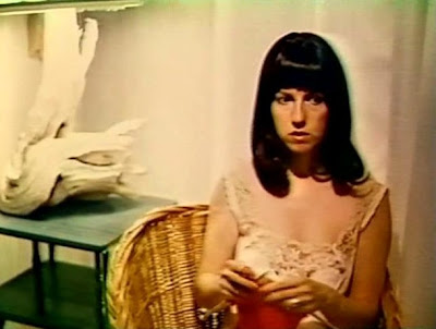In meantime, Paul and Anne consummate their sinister alliance with a little bedroom sexual intercourse. Ah, bedroom sexual intercourse. It's where straight people fuck. You mean? Yes, we get to see Marlane Willoughby's slender body in the throes of passion. Tasty. Spoon position, moan, "I want it," your pussy looks like Gene Shalit, skinny arms, doggie style, blow job, moan, spoon position, male orgasm, pubic hair/stomach. I like the way Marlene Willoughby would occasionally look over her shoulder in order to keep tabs on what her lover's cock was doing to her shalit-esque pussy.