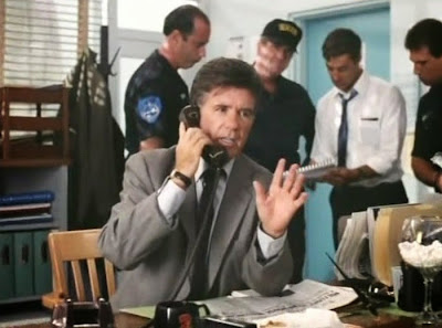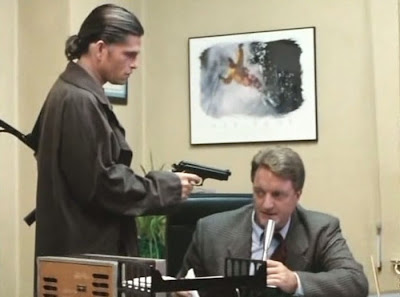Not wanting to fuck things up, their fearless leader, Luther (Jeff Kober), is taking no chances, as he is wearing a trench coat, sporting a ponytail and carrying an Uzi; he's what we in the stating the obvious business like to call a triple threat.