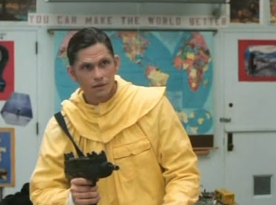 The only logical reason I can think of that justifies this bonehead decision on Corey Haim's part is that the writers wanted his character to get in touch with his inner MacGyver/MacGruber. Meaning, they thought it would be more interesting if he improvised weapons out of items found lying around your average classroom. (Like the fire extinguisher that shoots fountain pens?) Exactly. And it doesn't make sense for Corey Haim to be fashioning weapons out of unorthodox materials if he's carrying an Uzi, now does it?