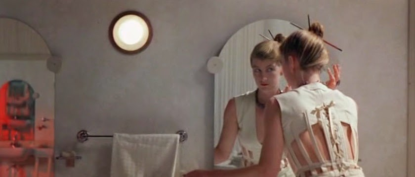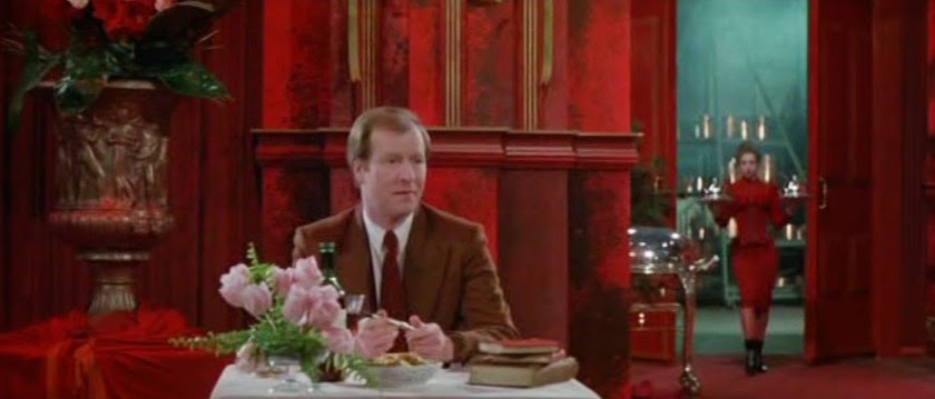 While gnawing indifferently on a piece of asparagus, Georgina notices Michael (Alan Howard), a blonde fellow in the caramel-coloured suit, reading/eating at a nearby table.