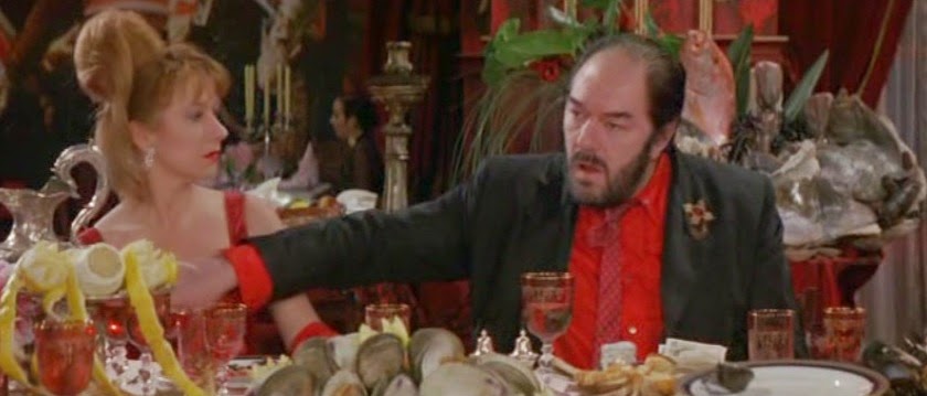 It's Thursday night, and Albert and the boys are clearly ready to enjoy a late night feast after a hard day of thieving; I'm assuming he's "the thief" in the film's title and that he runs some sort of crime syndicate. If that's the case, than Georgina is "his wife" and Richard (Richard Bohringer) is clearly "the cook." I wonder who "and her lover" is?