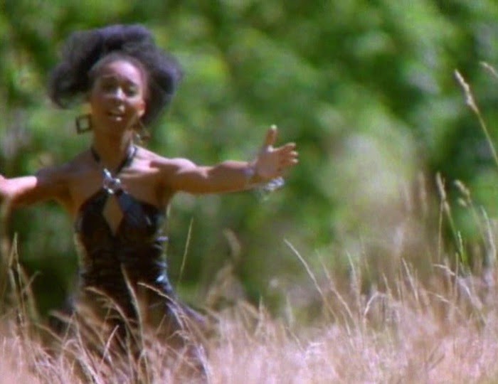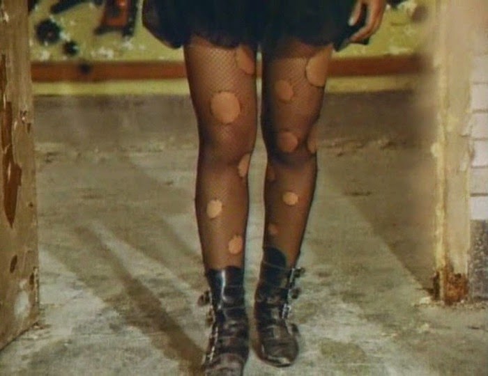 You could also call the two fantasy scenes where Darnell and the Tot's drummer, Rapunzel (Farin), fantasize about running towards one another in slow motion as filler. But I wouldn't do that. Any scene that features Rapunzel doing anything can't be declared as filler. You want to know why? It's simple, really. Look at Rapunzel's feet. See what she's wearing? Well, now you know. As anyone who knows me will tell you, I love pointy buckle boots. And while I've seen this particular style of boot worn in a number of different movies over the years, the type Rapunzel wears in Doom Asylum are pretty much perfect. 10/10 on the Goth-o-meter.
