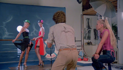 If anyone had any doubts whether or not this film takes place during the disco era, they won't have any whatsoever when they see the Disco Hot Legs photo shoot sequence. Flashing lights, roller-skates, tongue kissing, Travolta posing, double-scrunchies, triangle-shaped earrings and a throbbing disco song ("oooh, you should be dancing... love on wheels"), this scene has got everything a fan of this particular period of history could want and more.