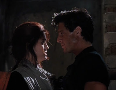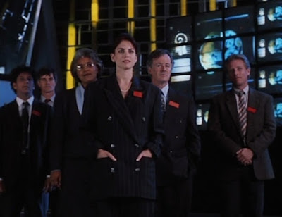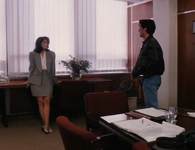 After some perfunctory sleuthing scenes (cool, floppy disks) and an action sequence where Spartacus' cyborg army takeover a nuclear power plant, we finally meet Liz McDowell (Jill Pierce), the deputy director of operations for ATG. I say, "finally," because this film has been a major sausage festival since the leggy lady scientist scene. At any rate, realizing that Jack Ryan is the only one competent enough to stop Spartacus, Liz decides to team up with him.