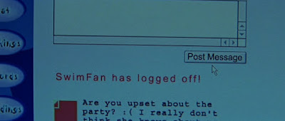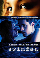 Looking back, I think I might have been a little hard on 1995 in my review of Powder. If any year deserves to be mocked for having no discernible character whatsoever, it's 2002. Seriously, 2002, you are one bland motherfucker. And the cast of 2002's Swimfan encapsulate this blandness by being one of the most boringly-attired groups of people I've ever laid eyes on. There is, however, one exception. And that is the film's heroin, Madison "I'm Not Going to be IGNORED" Bell. Played by Erika Christensen, the round-faced, shapely non-suppressive person wears leather skirts, trench-coats, argyle sweaters and heels, lot's of heels. To be fair, her peers are mostly jocks. In other words, their wardrobes are 99% hoodies and sweatpants. But still... What's that? What does the other 1% of their wardrobe consist of? Oh, that is usually made up of something black. And, no, they're not closet Goths... though, I kinda wish they were (Hey, bro. Wave-Gotik Treffen is going to be off the chain this year... now let's go drink Mountain Dew and play sports). Uh-uh, the reason they have a black outfit in their wardrobe is so that they will have something to wear at their friend's funeral when they're justifiably beaten to death with a baseball bat. Yep, you heard me. I said, "justifiably beaten to death." You got a problem with that? Good, let's move on.