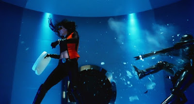 Using "flat-space technology" and "dimension-compressing" during her escape from The Archministry, Violet can defy gravity (she rides her motorcycle up walls) and can cause guns to materialize in her hand just by thinking about them. While everything I just mentioned sounds pretty cool, the execution is poor. You would better off watching Ghost in the Shell or the Æon Flux shorts that aired on MTV in the early 1990s.