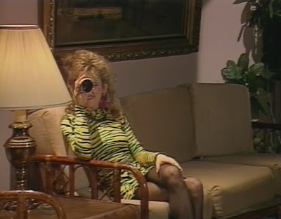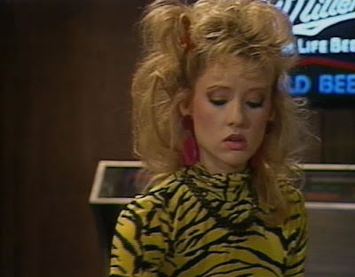 When Sam arrives to start the night-shift, he finds Taija Rae's Daisy the prostitute's skinny ass not making a dent in his office couch. I will say this, even though Taija no longer has the curves to properly fill her super-tight neon yellow tiger print hooker dress, the thrift store garment itself is quite fetching.