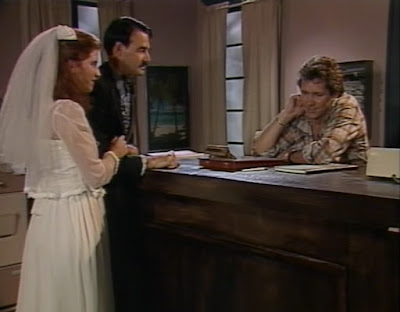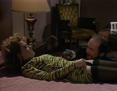 Just kidding, I'm a big fan of character development. Besides, I loved it when Martha Tirebiter calls the front desk to complain that the toilet in her room doesn't have a sanitation strip on it, and Juanita (Ona Z), the night maid, misinterprets Sam's instructions to put a sanitation strip room 13's toilet (there's a bit of a language barrier between them). Instead putting a strip on their toilet, she performs a striptease, complete with black fully-fashioned stockings and wacky sound effects, for a befuddled Martha and George. I know this is an odd thing to say, but pay close attention to Tantala's face as Ona Z strips, her exaggerated facial expressions are pure gold.