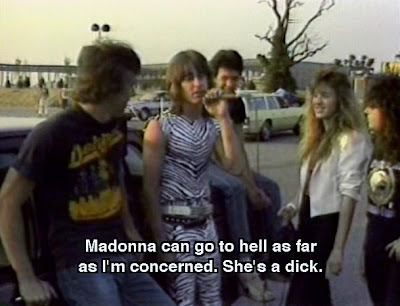 #4 -- Timmy's Friend. Every film, whether it be Xanadu or The Apple, needs a showstopper, and Heavy Metal Parking gets its when one of the directors asks "Timmy's Friend" to tell them the long story pertaining to how she and her friends managed to obtain backstage passes. What comes out of her mouth will shock and amaze those who have been wallowing in irony for most of their adult lives. When Timmy's Friend, who would have made the metal babe list had her speech not been so stirring, gets to the heart of Timmy's tale, I nearly dropped my bong (don't worry, it wouldn't have broke, as my wall-to-wall shag carpeting would have surely cushioned its fall).