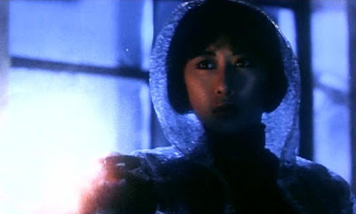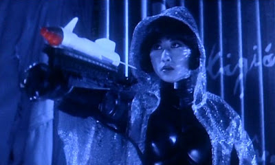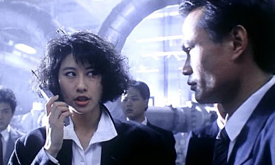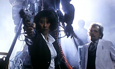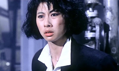 As I sit and stare at this blank slab of nothingness, trying desperately to come up with something clever to say, the scene from Roboforce (a.k.a. I Love Maria) where the female robot swoops in to rescue her male companions from certain death just in the nick of time is currently playing over and over again in my head. I think the reason this particular scene stands out from the rest is because I secretly wish I had a robot girlfriend, one who quotes Romeo and Juliet, drinks oil from a soda can and fires rockets from her wrists. Now, I realize what I just said is probably the dorkiest thing ever to be written in this site. But I don't care. I want a robot girlfriend, and I want it now! Oh, and if she could look exactly Sally Yeh, that would be great. I'm surprised you didn't go with robot Susan Tyrrell or robot Mary Woronov. Yeah, that was a tempting idea. However, I'd like to stick with the Sally Yeh model I saw in this Category III flick, directed by David Chung and Tsui Hark. Besides, I don't think Miss Tyrrell or Miss Woronov have the right temperament to play robots; they're too headstrong. At any rate, while I wouldn't exactly call myself a Category III expert, I think it's safe to say I have seen enough of them to know what to expect. And one of the main things I look for is weird shifts in tone. What I mean is, Hong Kong films made during this period seem to mix genres in a way that could be construed as haphazard. For example, one minute your watching a family-friendly action sequence where a buffoonish Tong Leung is attempting to take photographs of giant robot reeking havoc on a downtown street, and the next you're watching a forthright Sally Yeh put a bullet through the back of the head of some dweeb in a lab coat.