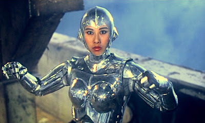 Unbeknownst to Chu, but Curly has re-assembled the Maria-bot behind his back. Hold up in an old monastery, Curly programs the new and improved Maria-bot to only respond to the command "I love Curly." Which makes sense because that last thing Chu wants to say out loud. After overcoming his distaste for the expression, "I love Curly," Chu eventually gains control of Maria. Unfortunately, the real Maria and her henchmen have tracked them down.What ensues is an awesome robot fight, one that is way better than anything that appears in those stupid Michael Bay movies (could you be more specific? no, I can not), a scene that features excessive grappling hook usage, a flying motorcycle, and more of that sweet Sally Yeh-based head tilting (mmm, Sally Yeh-based head tilting, it's what's for dinner). Tilt that head, you mechanical seductress.