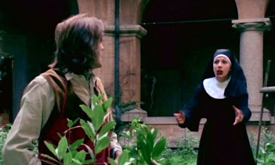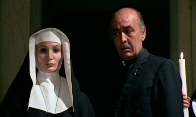And as far as perversion goes, check out the scene where a prematurely grey nun (Susan Forget) chokes Father Valerio in her room. No offense, but I'm not really into strangulation. No, pay attention to the part where she collapses on top of him mid-choke. What am I looking for? Look at her legs. Oh, they're sheathed in black nylons. Nice. I'm glad you pointed them out, because I was just about to declare The Other Hell a nylon-free zone.