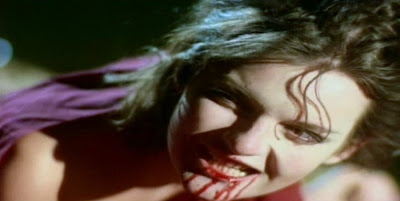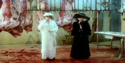 According to the doctor who is accompanying some proper ladies to the butchershop, the year is 1905, and everyone drinks blood. And not only that, it's great for the immune system. I don't know if I agree with that. But I will say this, we're only a minute into this thing and we've already had three striking images. The first, of course, being Brigitte Lahaie and Franca Maï dancing. The second is the sight of one of the proper ladies standing in a pool of ox blood. And the third is the close-up shot of one of the proper ladies rubbing ox blood over their lips. Sure, the latter two are kind of gross, but they're also strangely erotic, especially the lip rubbing one.